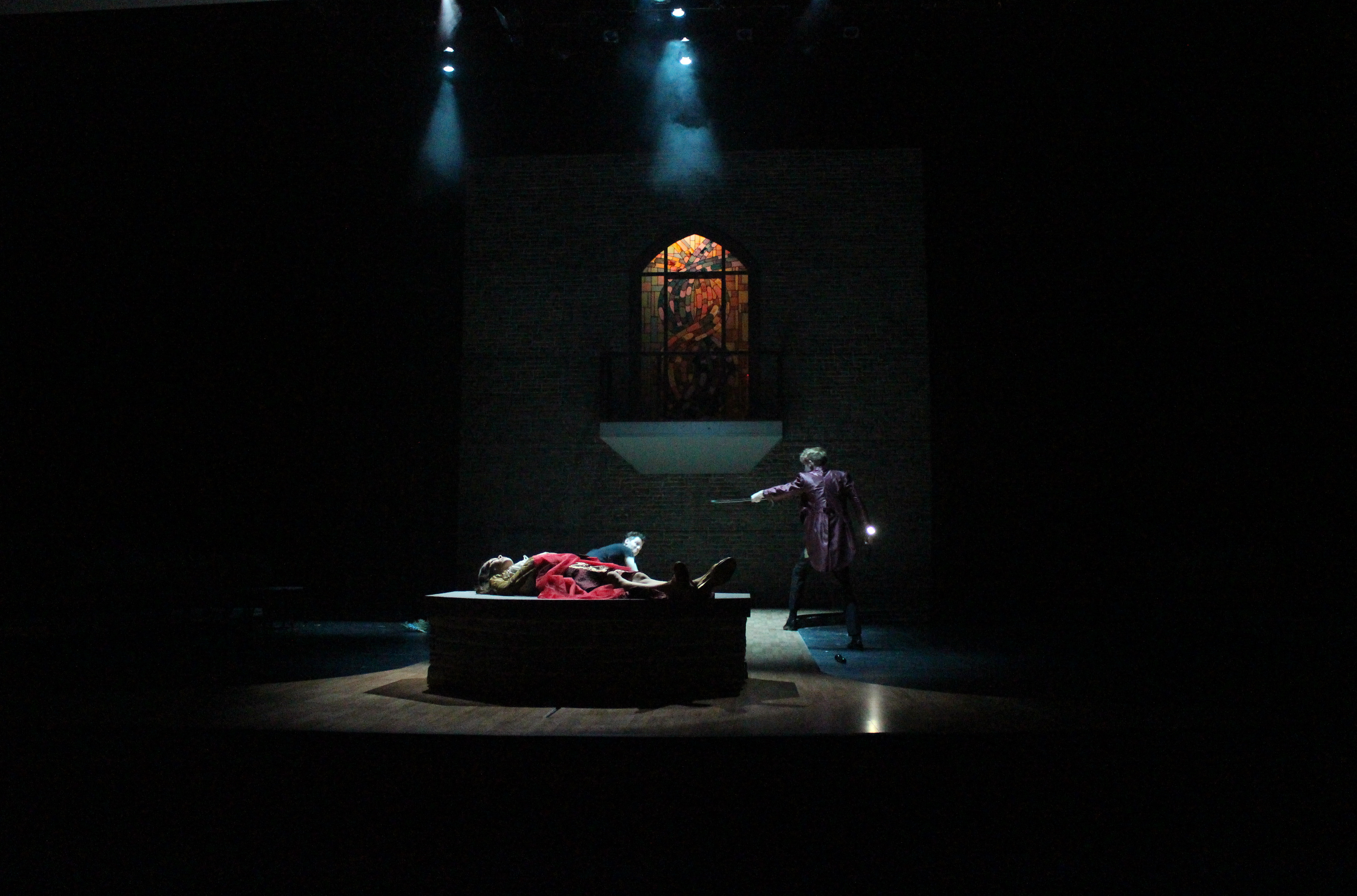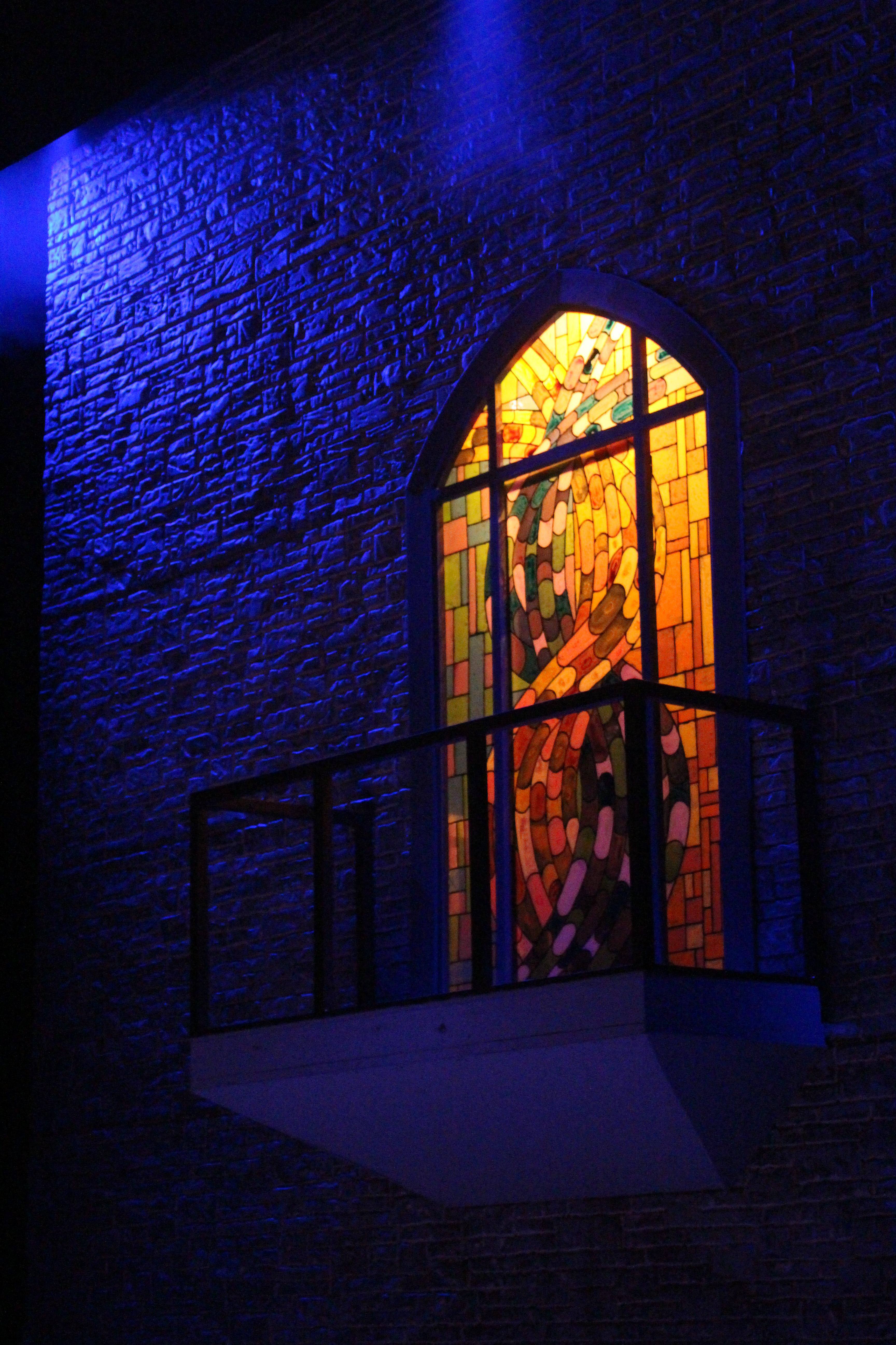 "i was assigned the task of designing and finding a way to execute the creation of our stained glass window. the two households were both represented throughout the show through a warm color palette and a cool color palette, and so we wanted to incorporate that into the stained glass. after researching different stained glass windows and symbols found within renaissance paintings i ended up with the idea of two trees growing together to form one. this represented the two families being separated but finding a way to become one. the warm color palette would converge with the cool color palette in the middle of the window. the design was executed on plexiglass. i created the vector drawing in adobe illustrator which was then transformed into a g-code file. the design was drawn on using the cnc router. using polyurethane combined with mixol colorant i was able to achieve my desired colors. the lighting used behind the window itself helped accentuate the design and bring more beauty to it."